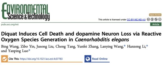 近日,伟德bv1946官网骆焱平教授、王兰英教授与环境科学与工程公司李汉增教授在环境领域期刊Environmental Science & Technology发表题为“Diquat induces cell death and dopamine neuron loss via reactive oxygen species (ROS) generation in Caenorhabditis elegans”的研究论文。其中,团队成员王兵为论文的第一作者,骆焱平教授、李汉增教授和王兰英教授为论文的通讯作者。