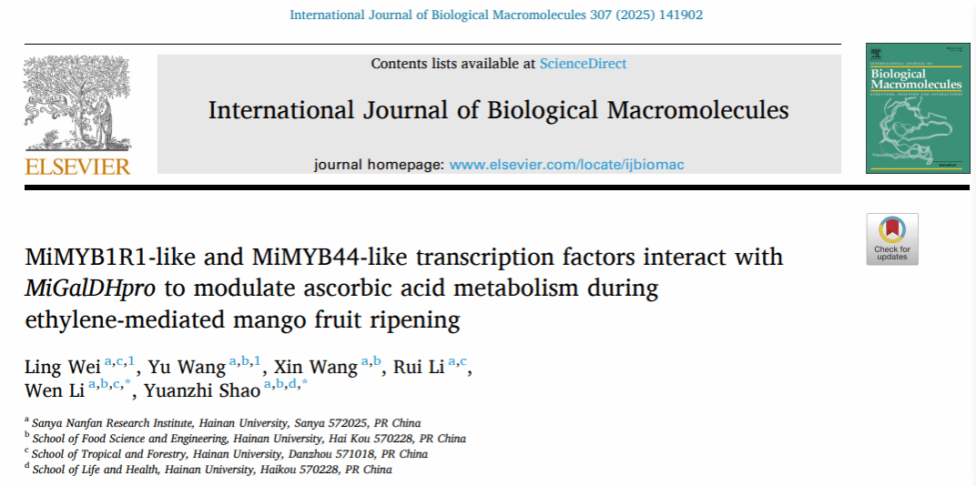 近日,李雯教授团队在国际知名期刊International Journal of Biological Macromolecules (中科院1区TOP, IF=7.7)上发表了题为“MiMYB1R1-like and MiMYB44-like transcription factors interact with MiGalDHpro to modulate ascorbic acid metabolism during ethylene-mediated mango fruit ripening”的学术论文。该研究得到了国家自然科学基金项目(32360778)和伟德bv1946官网芒果产业技术体系的经费支持。