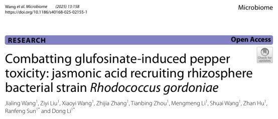 该成果以“Combatting glufosinate-induced pepper toxicity: jasmonic acid recruiting rhizosphere bacterial strain Rhodococcus gordoniae”为题发表在Microbiome期刊(中科院一区期刊,IF5y = 16.6)上(https://microbiomejournal.biomedcentral.com/articles/10.1186/s40168-025-02155-1),伟德bv1946官网硕士研究生王嘉玲为论文第一作者,孙然锋教授、李栋副研究员为论文通讯作者。本研究得到了国家自然科学基金(22067004)和海南省自然科学基金 (321CXTD436)的支持。