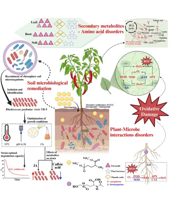 草铵膦(glufosinate, GLU)作为一种广谱触杀型灭生性除草剂,是全球第二大非选择性除草剂,广泛用于多种作物田中杂草的防控。生产调研中发现土壤中残留的草铵膦对辣椒生长及土壤环境构成潜在威胁,制约辣椒产业的可持续发展。本研究通过分析草铵膦胁迫下辣椒的生长响应、根际微生物群落结构变化及植物代谢物应答,发现草铵膦显著改变辣椒的氨基酸及次生代谢物谱,并富集有益根际细菌—戈登氏红球菌(Rhodococcus gordoniae)。