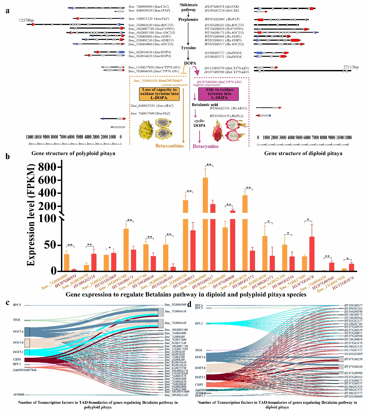 通过多组学整合分析发现,染色质三维折叠结构和转录因子结合位点共同调控甜菜红素代谢通路,这解释了二倍体燕窝果呈现红色而多倍体呈现黄色的分子机制——基因表达差异与染色质区室化特征共同作用的结果(图8)。研究显示,多倍体燕窝果中CYP736A12基因的低表达导致其丧失了酪氨酸氧化能力,从而最终形成黄色果实。这一现象表明,拓扑关联结构域(TAD)边界同时具有激活和抑制的双重调控功能,能够机制性地控制TAD内部基因的表达活性。这些发现从分子层面阐明了燕窝果无法合成甜菜黄素的关键原因。