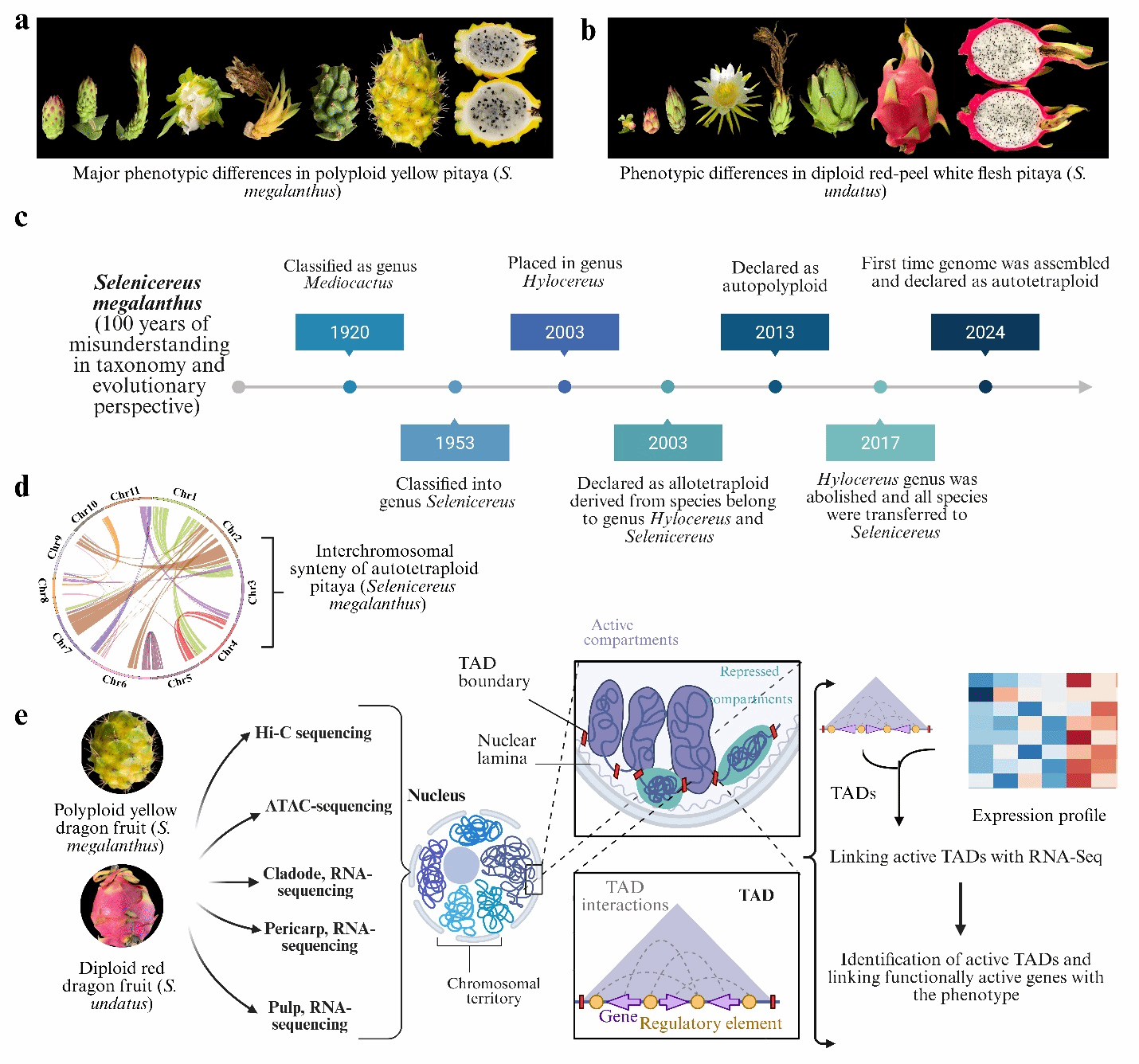 火龙果隶属仙人掌科蛇鞭柱属,约起源于6500万年,其中燕窝果(Selenicereus megalanthus, 2n=4x=44)和火龙果(S. undatus, 2n=22)最具商业和消费价值。火龙果具有艳丽的外观与独特的风味,富含维生素、抗氧化剂、矿物质、膳食纤维和预防癌症等功效。解析基因组结构影响植物性状的机理是作物研究的前提,随着火龙果需求的日益增长,尽管基因组工具取得巨大的进步,但由于缺乏火龙果参考基因组,火龙果的品种创新受到严重阻碍,迫切需要二倍体火龙果与四倍体燕窝果的表型变异图谱,为火龙果的育种研究提供科学依据。