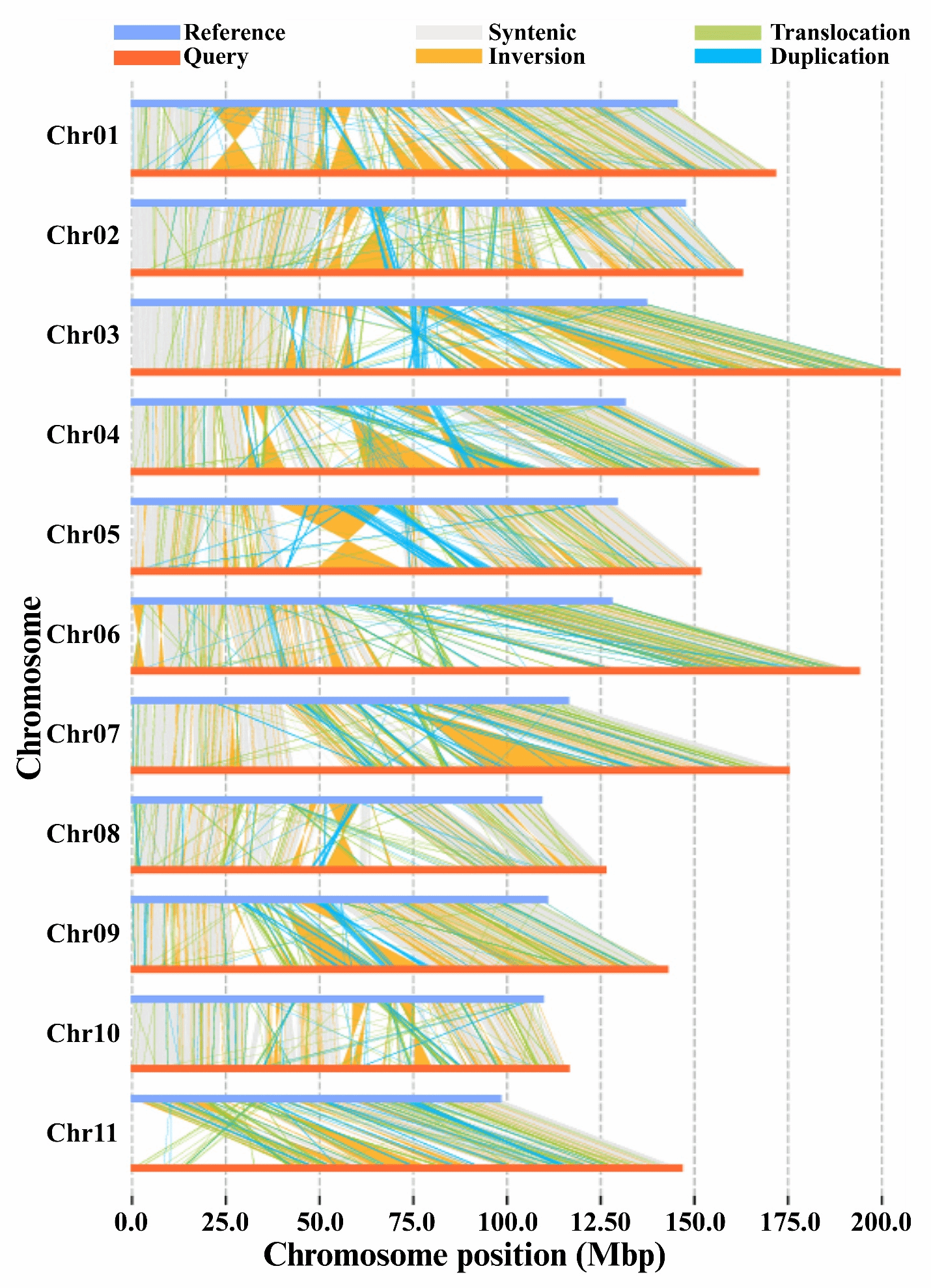 共线性分析揭示了燕窝果与普通二倍体火龙果基因组中存在广泛的结构变异,包括大片段倒位、易位、重复(图5)。通过将同源四倍体燕窝果与二倍体火龙果进行比较,研究者鉴定出41,409个存在-缺失变异(PAVs)、82,394个PAVs、1,245个倒位、15,725个易位、23,325,494个SNPs、2,294,810个插入缺失变异以及19,928个拷贝数变异(CNVs)。这些结构变异主要分布在基因间区,其中燕窝果包含31,506-66,158个PAVs、710个倒位、13,533个易位以及14,890个CNVs。