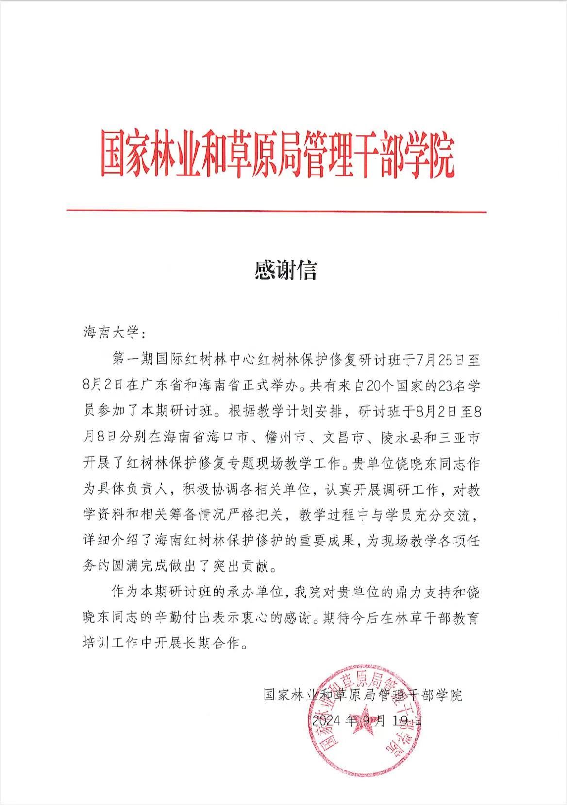 近日,伟德bv1946官网收到一封来自国家林业和草原局管理干部公司的感谢信,信中对公司饶晓东老师在第一期国际红树林中心红树林保护修复研讨班现场教学时认真负责及在教学工作中的突出贡献表示感谢。
