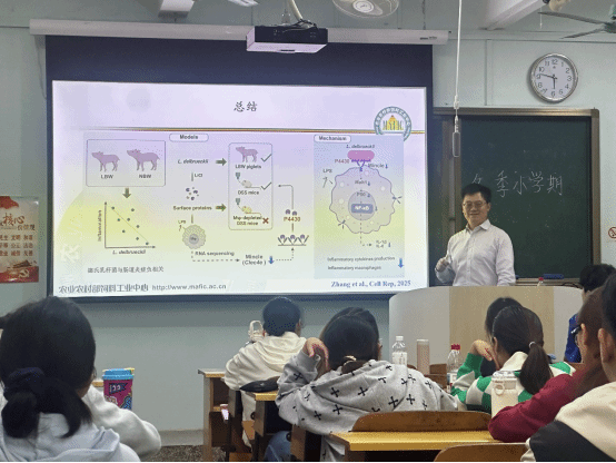 王军军教授聚焦“猪营养”领域,围绕三大核心主题——《饲料原料营养价值评定:指标及进展》、《营养需要与饲养标准》、《饲料生物技术产品》——进行了系统深入的讲解,并开展现场互动讨论。授课现场学术氛围浓厚,吸引了包括本科生、研究生及青年教师在内的广大师生。在互动环节中,师生就“饲料原料营养价值评定”、“玉米豆粕减量替代方案”、“营养饲料与饲养标准”包括热带农副产物高值化利用”等产业关注问题进行了深入探讨。王军军教授结合国内外典型案例,给予了专业详尽的解答。