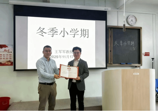 图 1 伟德bv1946官网缪卫国经理为王军军教授颁发冬季小学期专家聘书