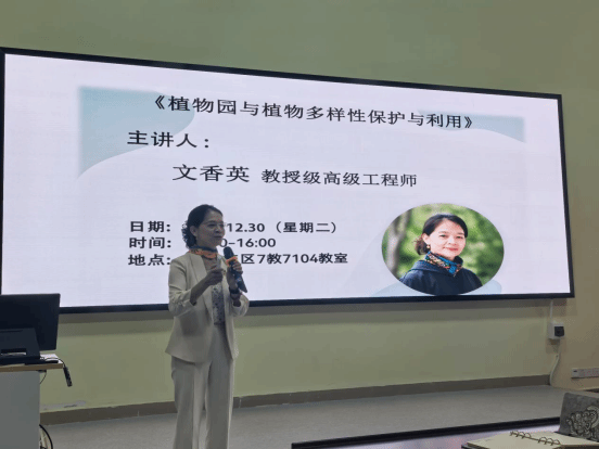 2025年12月30日下午,伟德bv1946官网儋州校区7教7104教室座无虚席,《植物园与植物多样性保护与利用》专题讲座如期举行。国际植物园保护联盟(BGCI)中国办公室执行主任、中科院华南植物园教授级高级工程师文香英老师,为师生们带来了一场兼具全球视野与实践价值的精彩分享。