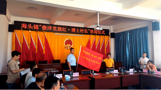欢迎仪式由海头镇党委组织委员赖俊杉主持,他首先介绍了出席欢迎仪式的镇委、镇政府主要领导、村委干部以及当地的企业代表。红坎村村委会书记吴高盛就红坎村的历史情况、党委工作以及主要面临的问题进行了详细介绍。各位博士村长认真聆听记录,有针对性的向吴书记了解情况。